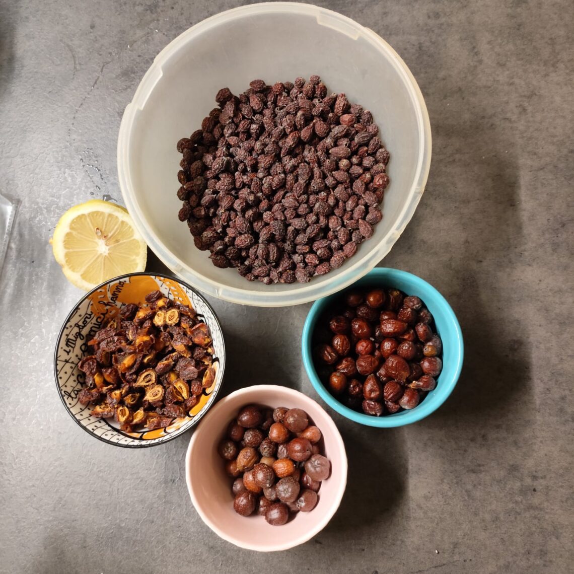 Ho usato l’essiccatore perché altrimenti secondo me marcivano. Nella foto la prima tranche: ho fatto frutta secca (sinistra), da farina (alto), grosse e non mature sotto (destino da scrivere), pronte al consumo (destra).